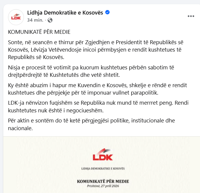 Sipas komunikatës së LDK-së, nisja e votimit pa kuorum kushtetues përbën, siç thuhet, “sabotim të drejtpërdrejtë të Kushtetutës dhe vetë shtetit”, duke e quajtur këtë veprim abuzim me Kuvendin e Kosovës dhe përpjekje për imponim politik.