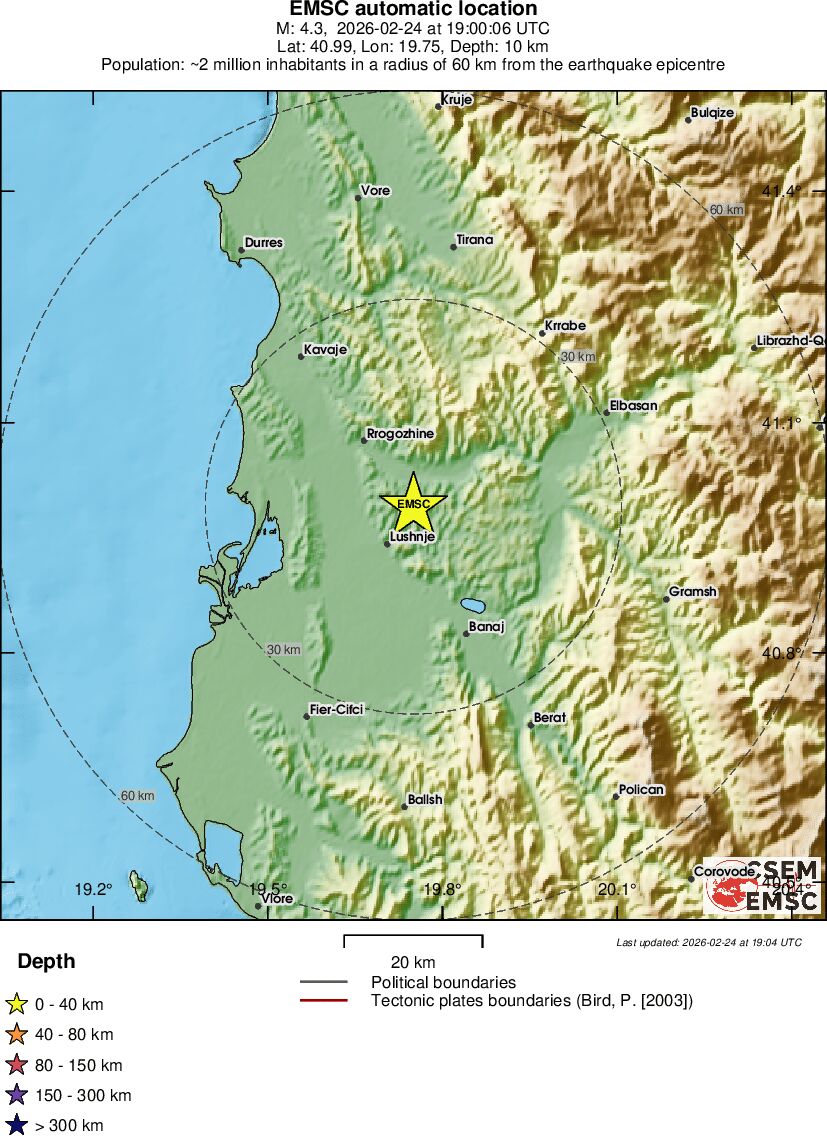 Lëkundjet janë ndjerë të forta nga banorët e zonave përreth, por deri më tani nuk raportohen dëme në njerëz apo dëme materiale.