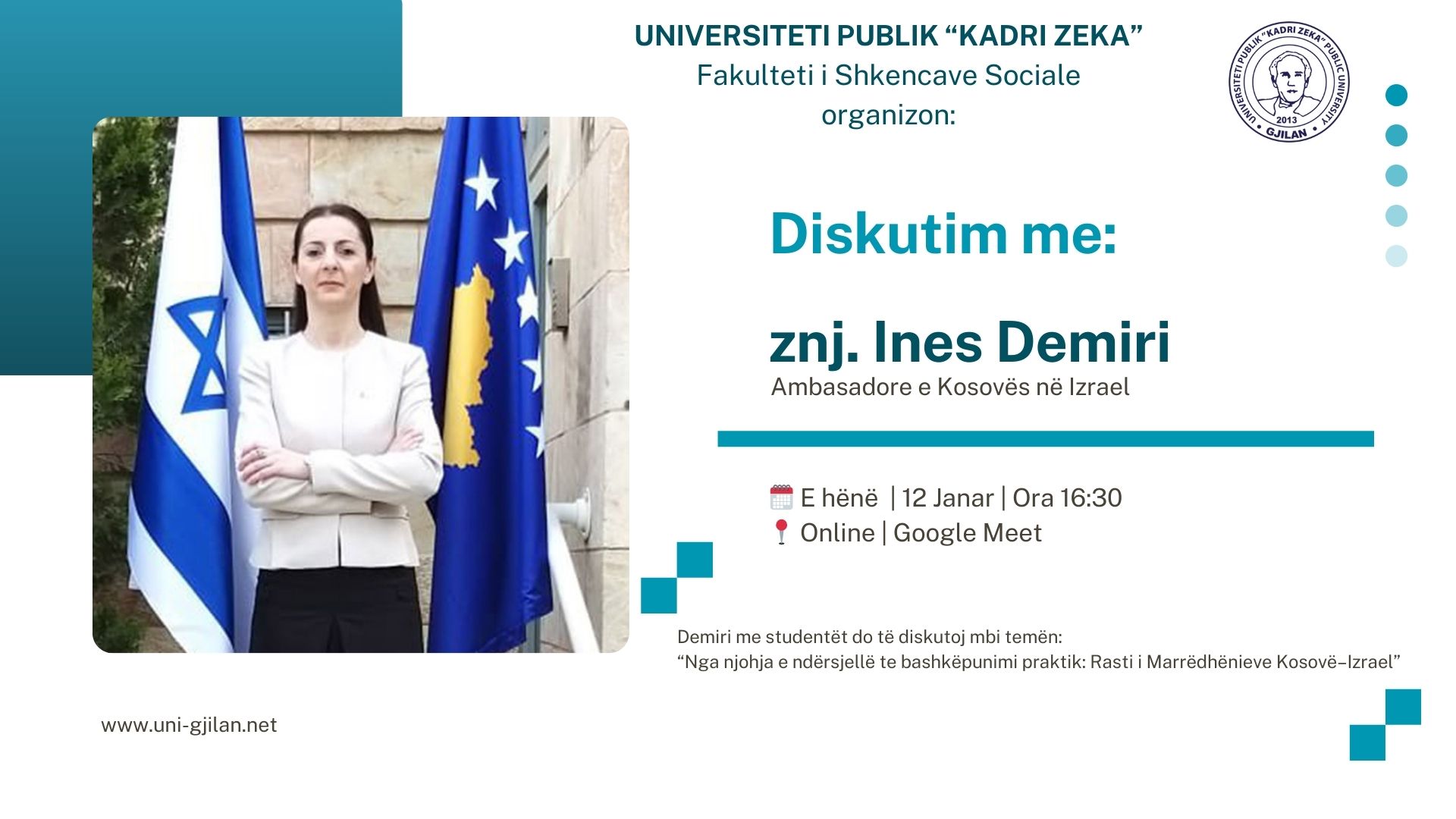 Me organizimin e Fakultetit të Shkencave Sociale të Universiteti Kadri Zeka dhe me ftesë të profesorit Lukas Mandl, Shkëlqesia e Saj, Ines Demiri, Ambasadore e Republikës së Kosovës në Izrael, mbajti një ligjëratë me temën “Nga njohja e ndërsjellë te bashkëpunimi praktik: Rasti i Marrëdhënieve Kosovë–Izrael”.